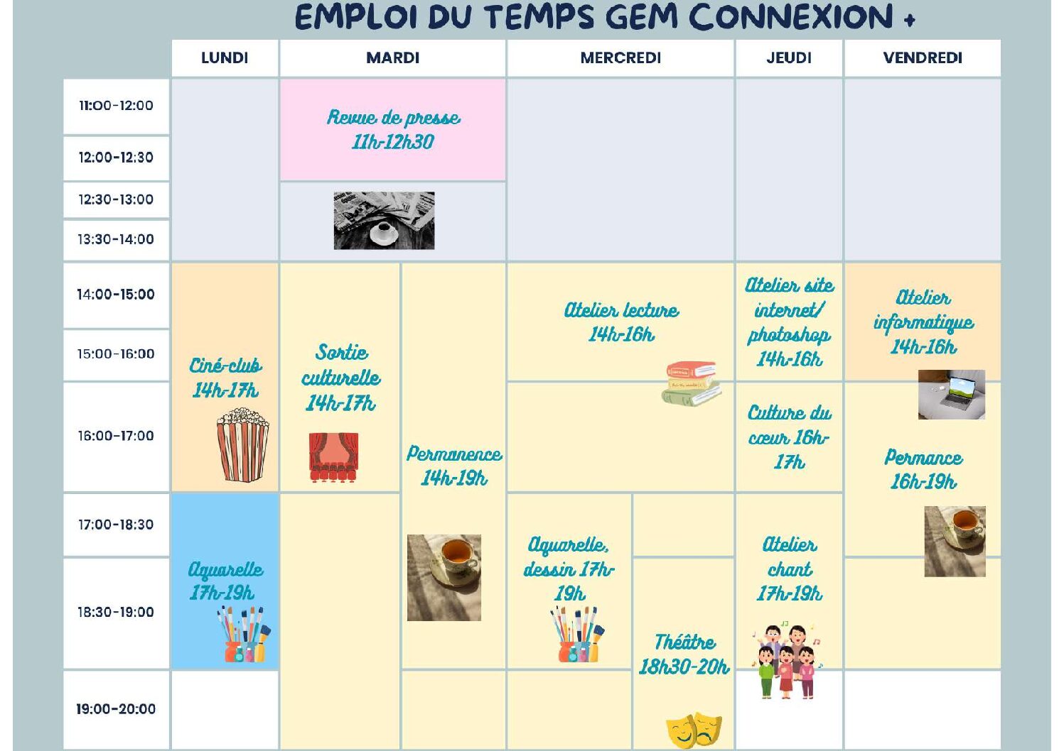 • Pendant les temps de permanence informelle, venez prendre un café, faire connaissance, discuter ou vous reposer… et pourquoi pas faire des jeux de société ou utiliser les postes informatiques…